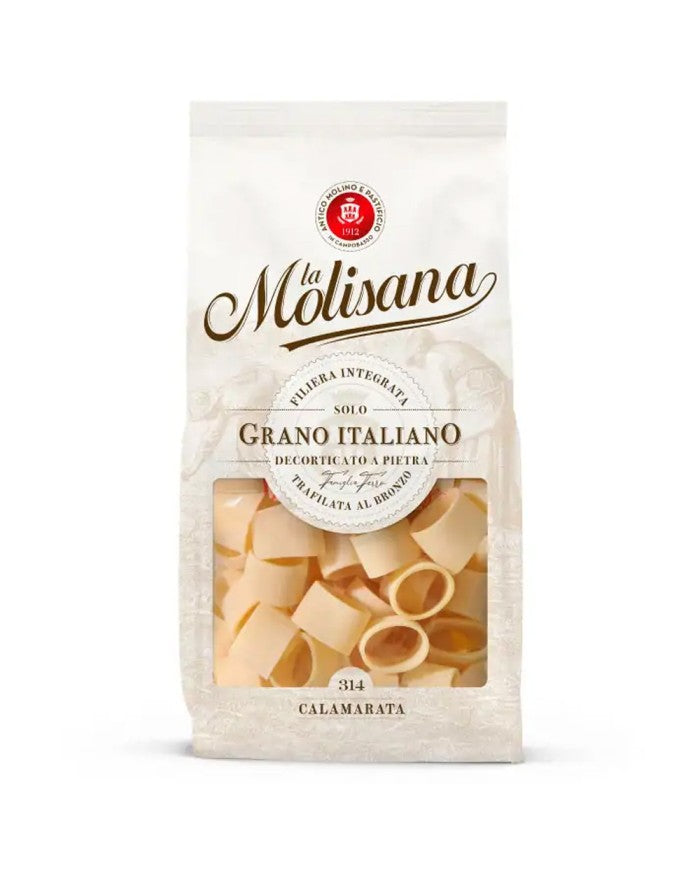 Pasta di semola di grano duro 100% italiano decorticato, trafilata al bronzo per ottenere una pasta ruvida e tenace, compatta in tutte le sue parti, elastica in masticazione con un'eccellente tenuta in cottura, impastata con acqua pura iposodica.