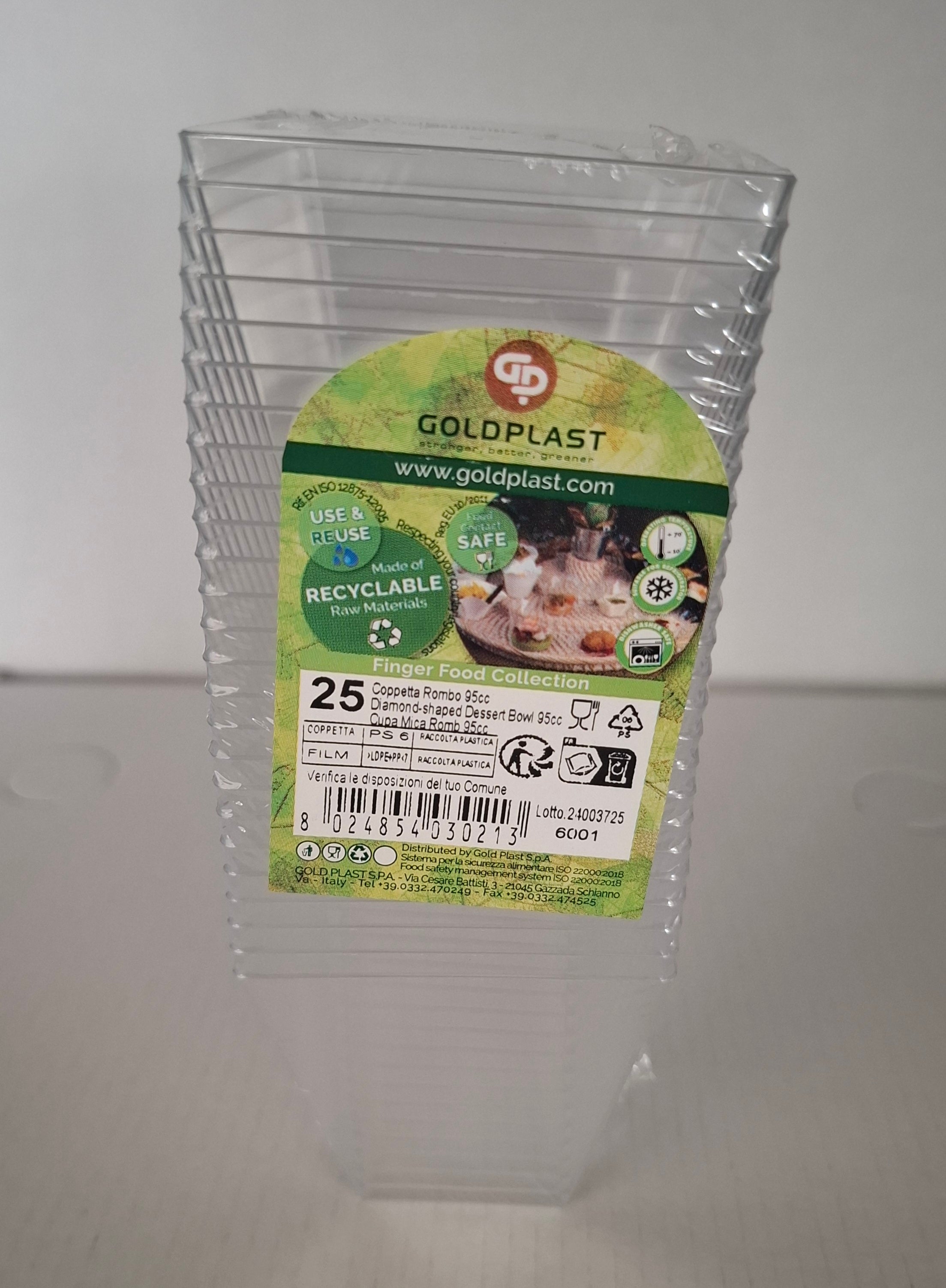 Coppette Gold Plast Rombo trasparenti 95cc, confezione da 25pz.Coppette Gold Plast Rombo trasparenti 95cc per finger food sono ideali per... Per saperne di più