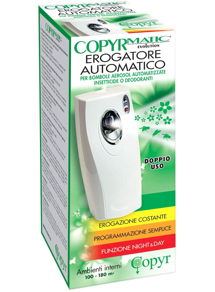 COPYR - Copyrmatic erogatore automatico per bombole insetticide o deodorantiIstruzioni per l'uso:funziona a batterie (2 pile mezza torcia C) non... Per saperne di più