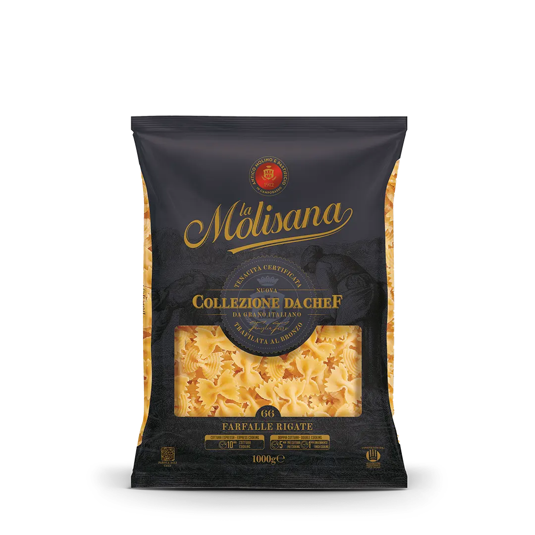 Come non innamorarsi delle farfalle in tavola? Le Farfalle rigate 66 rappresentano un unicum: dimensioni accurate e una inedita rigatura, la rendono perfetta per realizzare piatti non solo gustosi, ma estremamente scenografici.