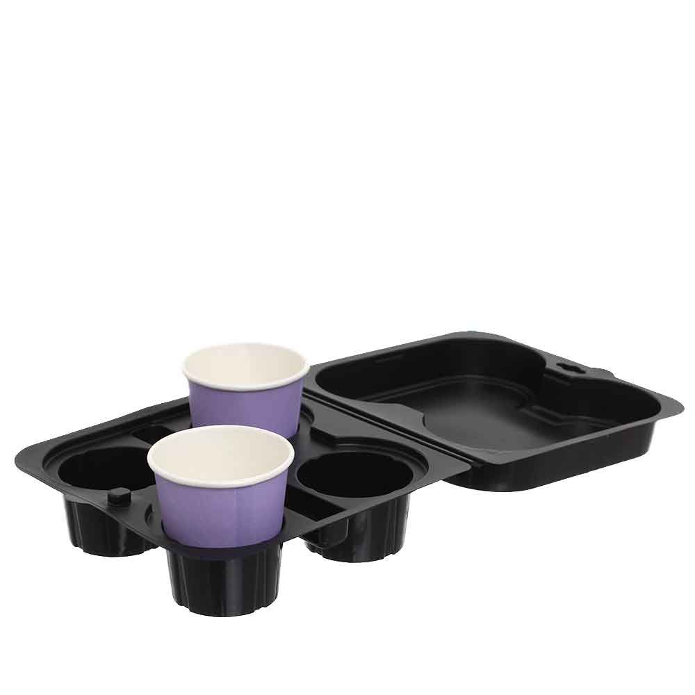 Vassoi porta bicchieri Koffepak richiudibili in plastica nera, con cavità per inserire 4 bicchieri da asporto e palette. Contenitori da... Per saperne di più