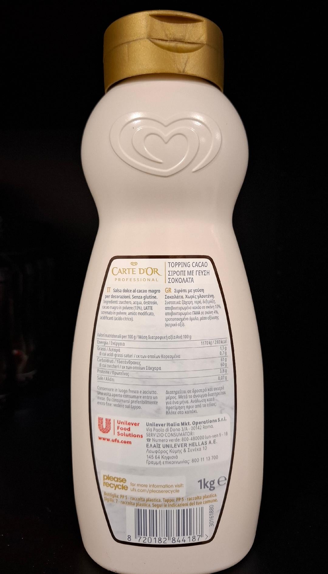 TOPPING CIOCCOLATO CARTE D'OR 1KGSalsa dolce per decorazioni al cacao magroSenza glutine10% di cacaocon latte scremato in polveresenza conservanti Per saperne di più
